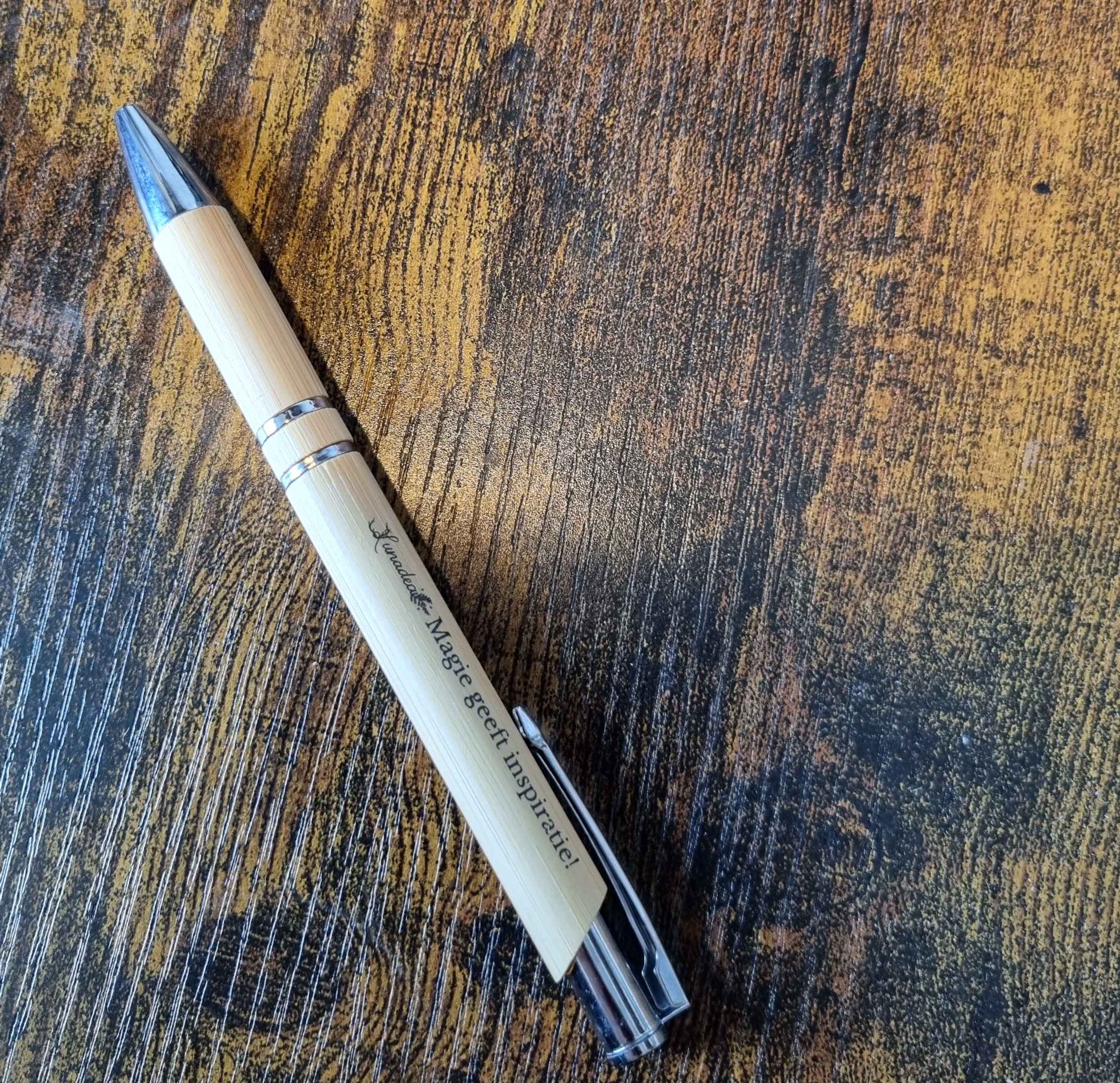 In bamboe uitgevoerde pen met opdruk.